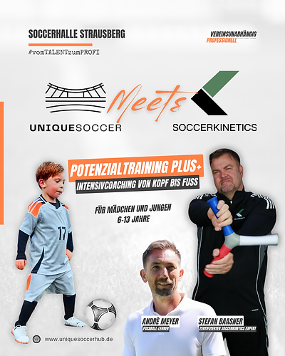 Unter der professionellen Anleitung von Fußball-Lehrer André Meyer und dem Experten für neurozentriertes Training, Stefan Baasner, erwartet Dich ein einzigartiges Trainingskonzept. In kleinen, wechselnden Gruppen erlebst Du Training auf eine andere Art und Weise: klassische fußballspezifische Impulse wechseln sich mit spielerischen, neuartigen Reizen ab – gezielt ausgerichtet auf die Bereiche Technik, Kognition, Koordination und Visualisierung. Diese Kombination sorgt für maximale Wirkung auf Körper und Kopf. Die Einheiten fordern Dich mental wie physisch, steigern Deine Wahrnehmung, Entscheidungsfähigkeit und technisch-saubere Ausführung unter hohem Zeit- und Gegnerdruck. Durch die Verbindung von professionellem Fördertraining und neurozentrierten Übungsformen entsteht ein intensives Erlebnis mit langfristigem Entwicklungseffekt – anspruchsvoll, modern und einzigartig im Fußballtraining. Treffpunkt: 15 Minuten vor Trainingsbeginn in der Halle. Trainingsbekleidung: Training in der Halle (kann trotzdem kühl sein). Umkleidekabine ist vorhanden – gerne bereits umgezogen kommen. Schuhe: Training auf Kunstrasen. Multinocken ideal Keine Stollenschuhe! Wichtig mitbringen: Aufgefüllte Trinkflasche Schienbeinschoner Wir freuen uns - Dich erwartet ein professionelles Coaching – mit Training, Intensität & Spaß garantiert!